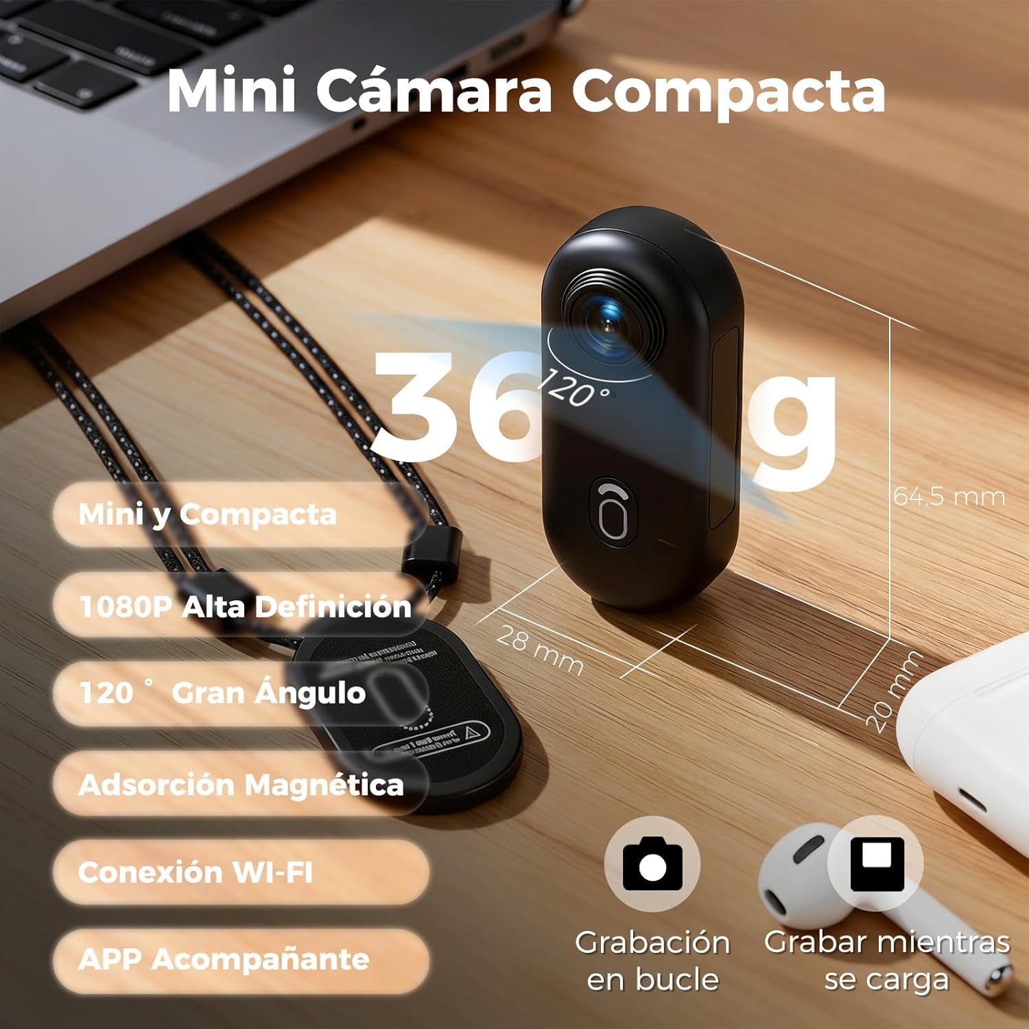 Cuerpo compacto de 64.5 x 28 mm. Graba en 1080P con gran ángulo de 120°. Ligereza total para uso diario.